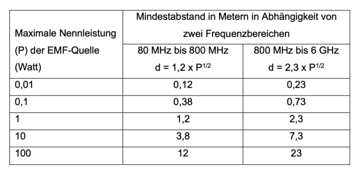 Tabelle 1: Angaben zum Mindestabstand zwischen Quellen von EMF (z.B. Hochfrequenzsendern im Haushalt) und beispielhaft einer Insulinpumpe (hier einer von MiniMed 640G, 670G, 780G). Der Abstand ergibt sich aus der Energie und der Frequenz des EMF (d-Abstand, P-Leistung, MHz – Megahertz, GHz – Gigahertz) [1,2]. Da andere Insulinpumpen und Geräte die gleiche IEC-Norm zu erfüllen haben, können diese Angaben als allgemeingültig angesehen werden.